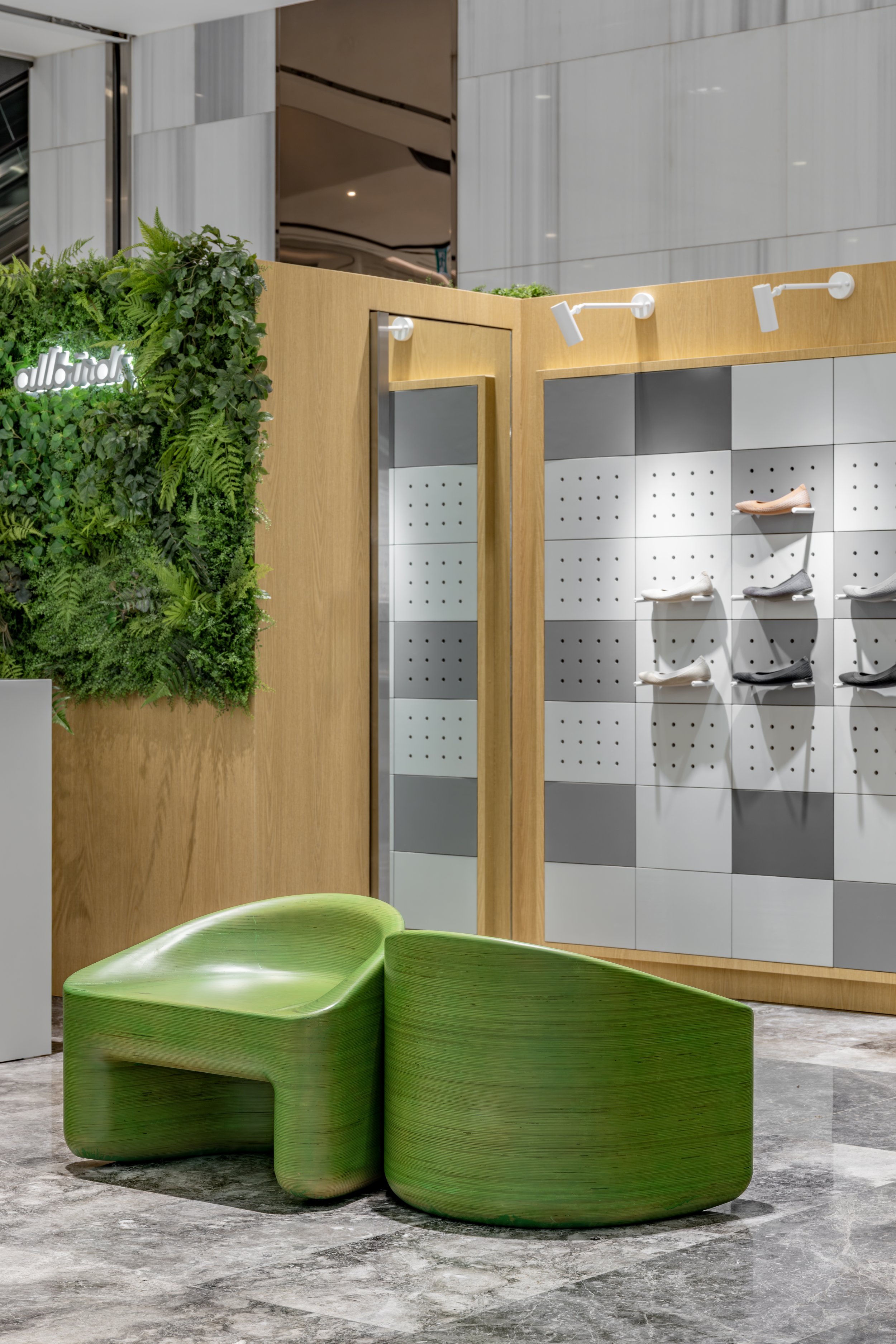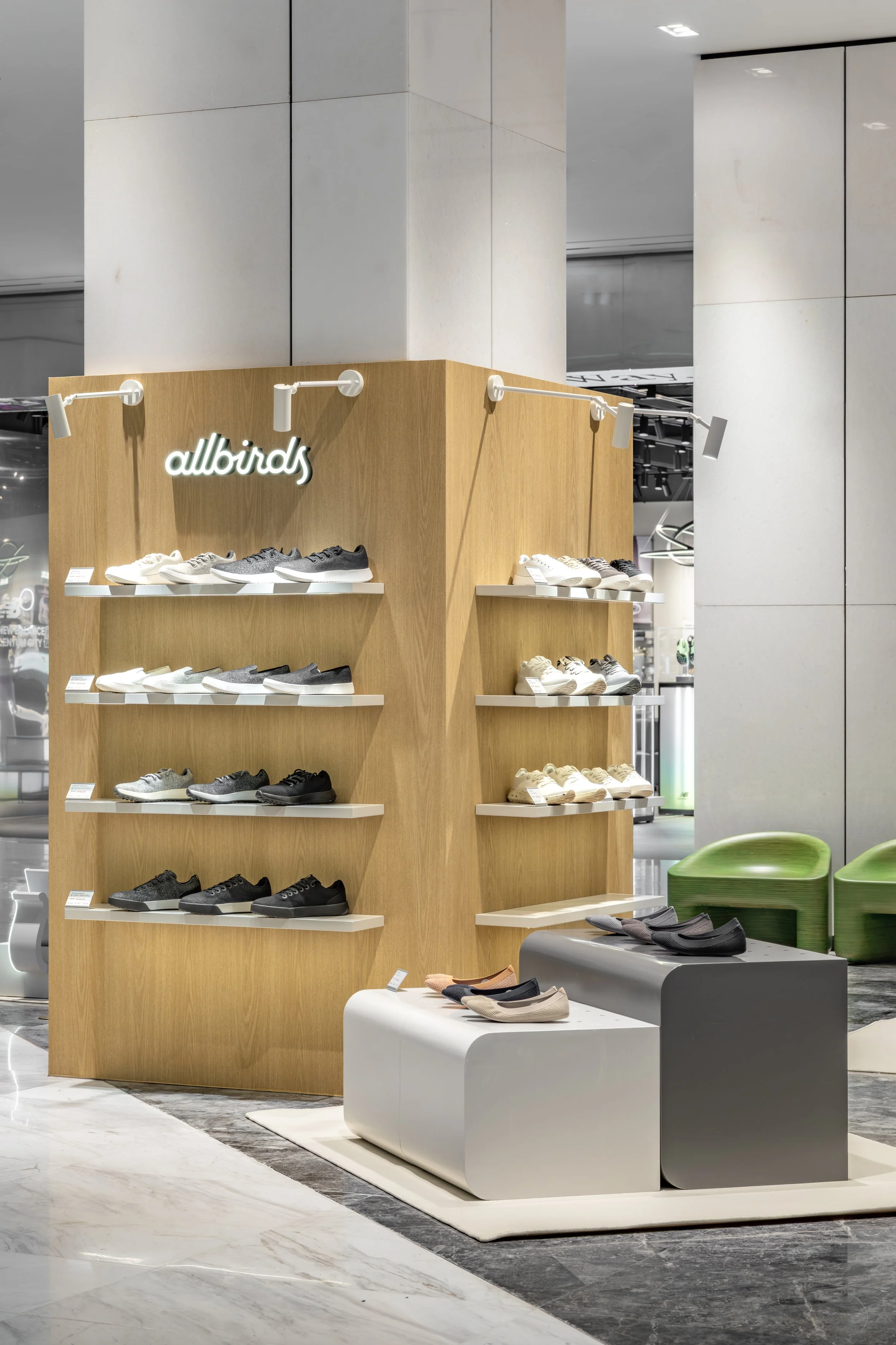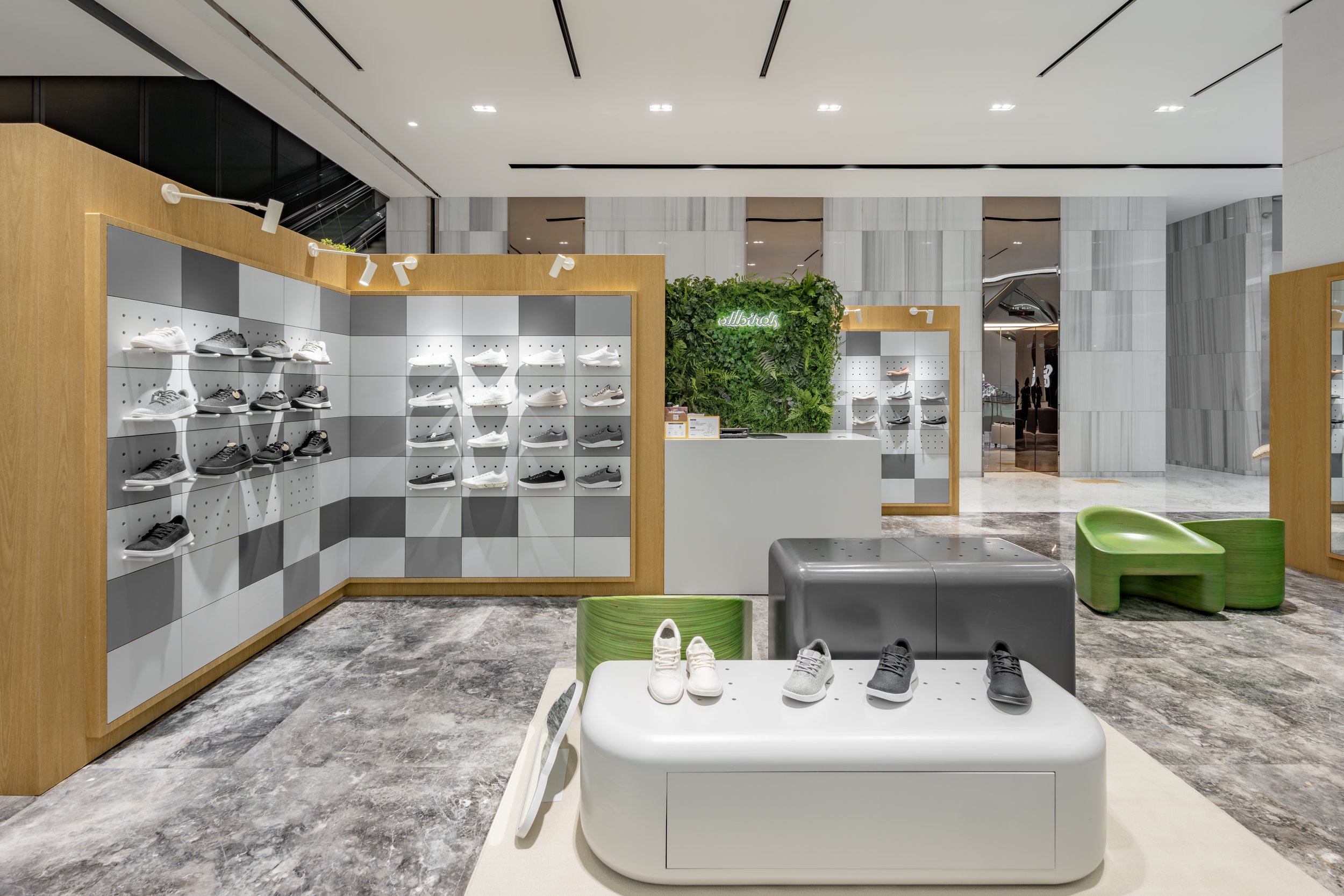 This approach delicately reflects Allbirds’ philosophy of sustainability across the entire store, offering visitors a quiet moment to connect with the brand’s values and story.
