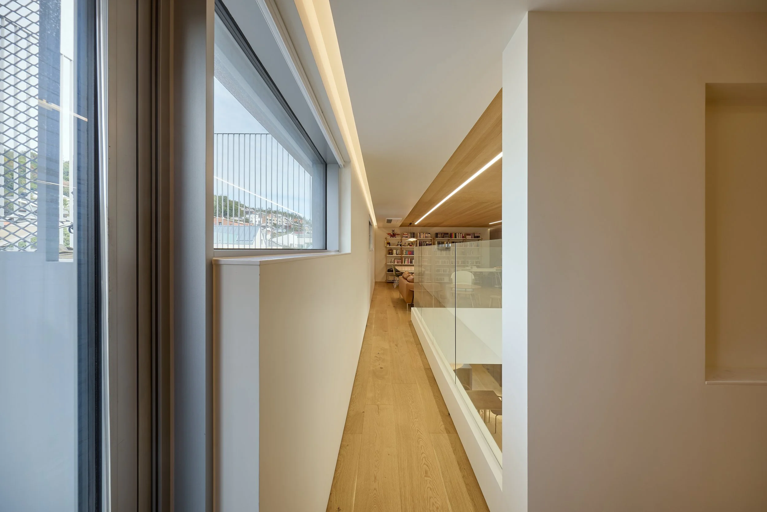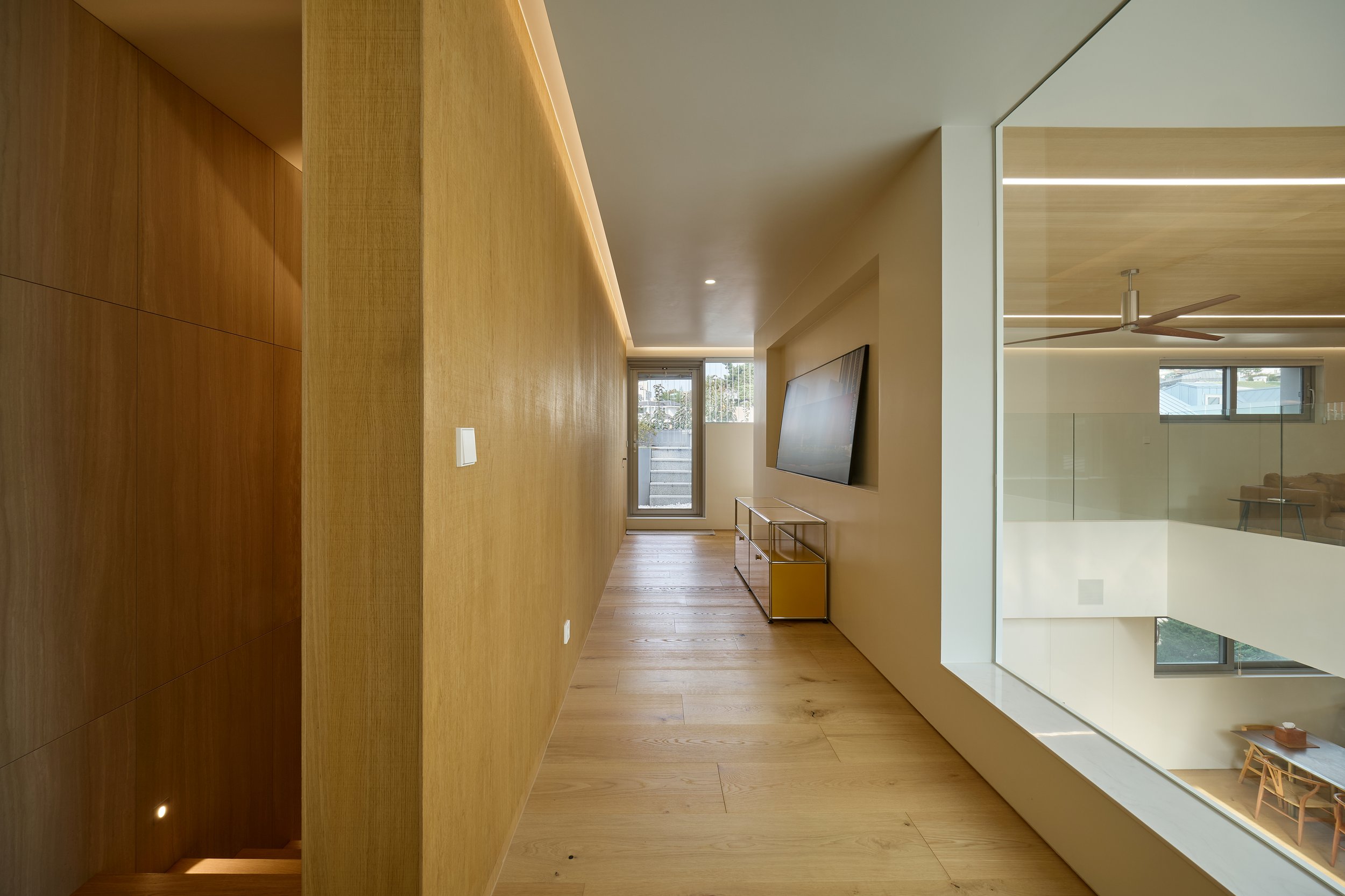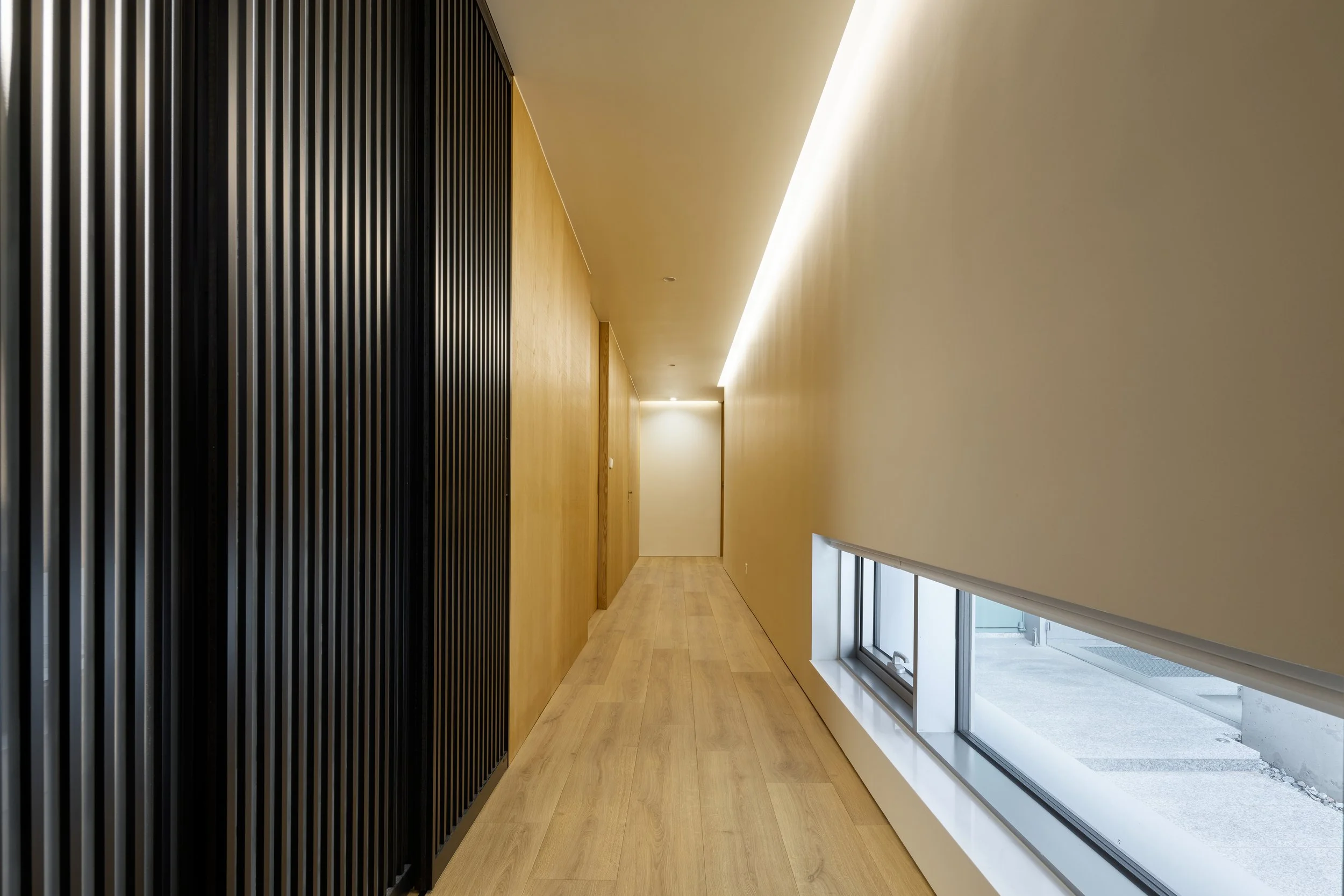 연희동 주택은 목재 마감이 공간의 구조적 흐름을 이끄는 사례입니다. 공용부의 천장은 따뜻한 나무 톤으로 마감되어, 수평적으로 공간을 안정시키며 빛을 고르게 확산시킵니다. 계단실 벽과 계단은 같은 재료를 이어 사용하여, 상하층을 연결하는 수직 동선이 하나의 연속된 목재 덩어리처럼 인식되도록 했습니다. 이는 단순한 이동을 넘어, 공간의 중심축을 형성하는 장치가 됩니다.