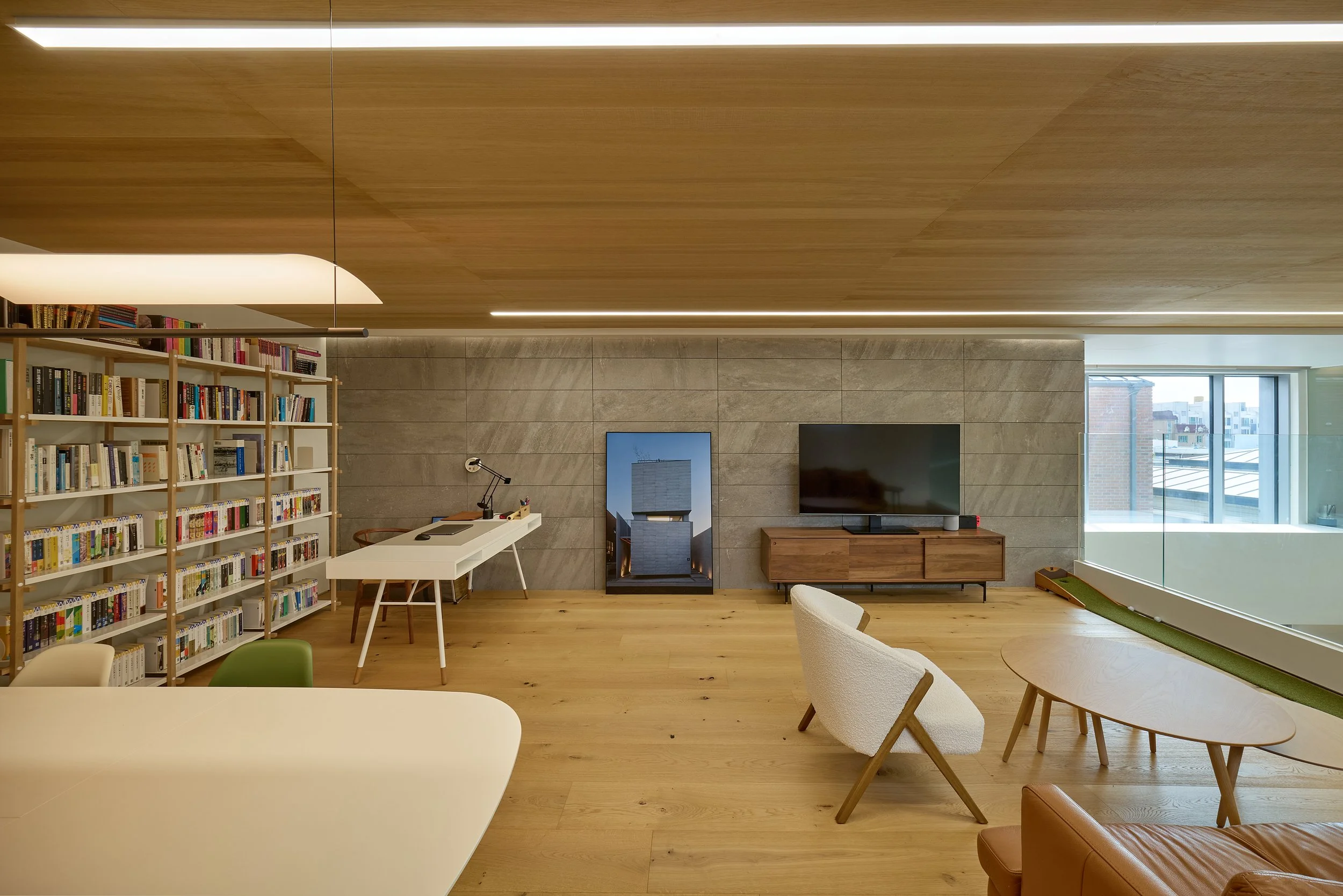 사적 공간의 벽면 역시 목재로 마감해, 공용부에서 이어진 재료의 언어가 생활 공간 안에서도 끊김 없이 경험되도록 했습니다. 이로써 공용과 사적 영역 사이의 경계가 단단히 구분되기보다, 하나의 따뜻한 톤 안에서 유기적으로 연결되도록 설계되었습니다.