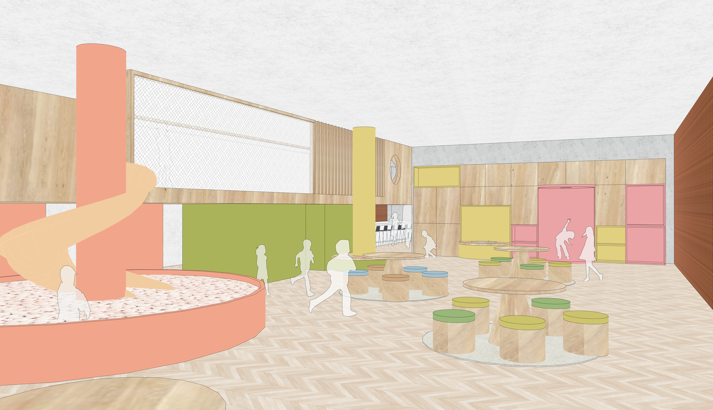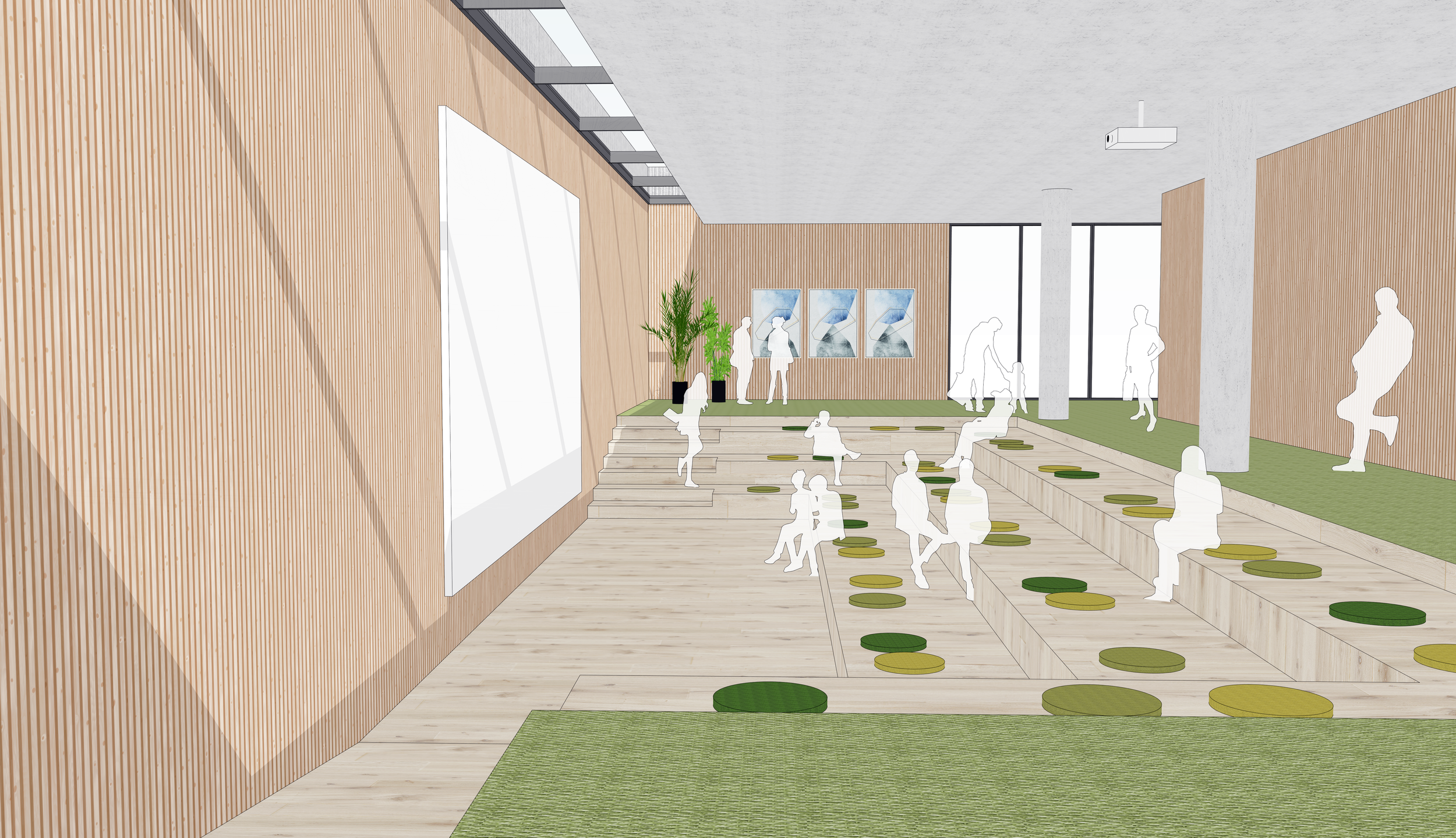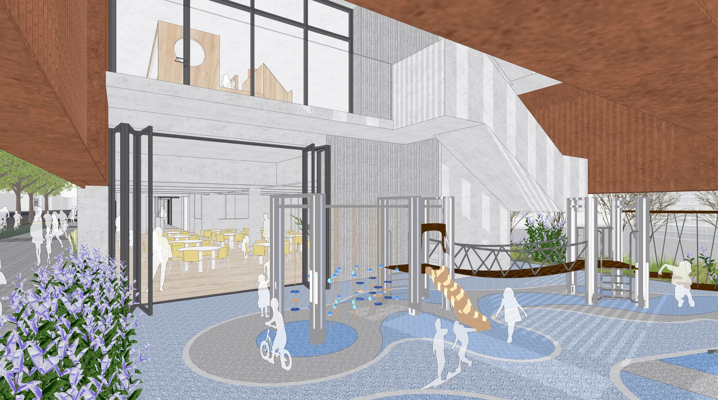프로그램은 1층 어린이집, 2층 키즈카페, 3층 청소년 스터디카페, 4층 경로당, 5층 열린 강당으로 구성됩니다. 이는 연령대별 프로그램의 적층이면서도, 공용 홀과 테라스를 통해 세대가 시각적으로 교차하고 간접적으로 교류할 수 있는 구조적 장치입니다. 층마다의 고유성을 존중하면서도, 서로를 배제하지 않는 느슨한 연결을 만들어내는 것이 이 건축의 핵심 전략입니다.