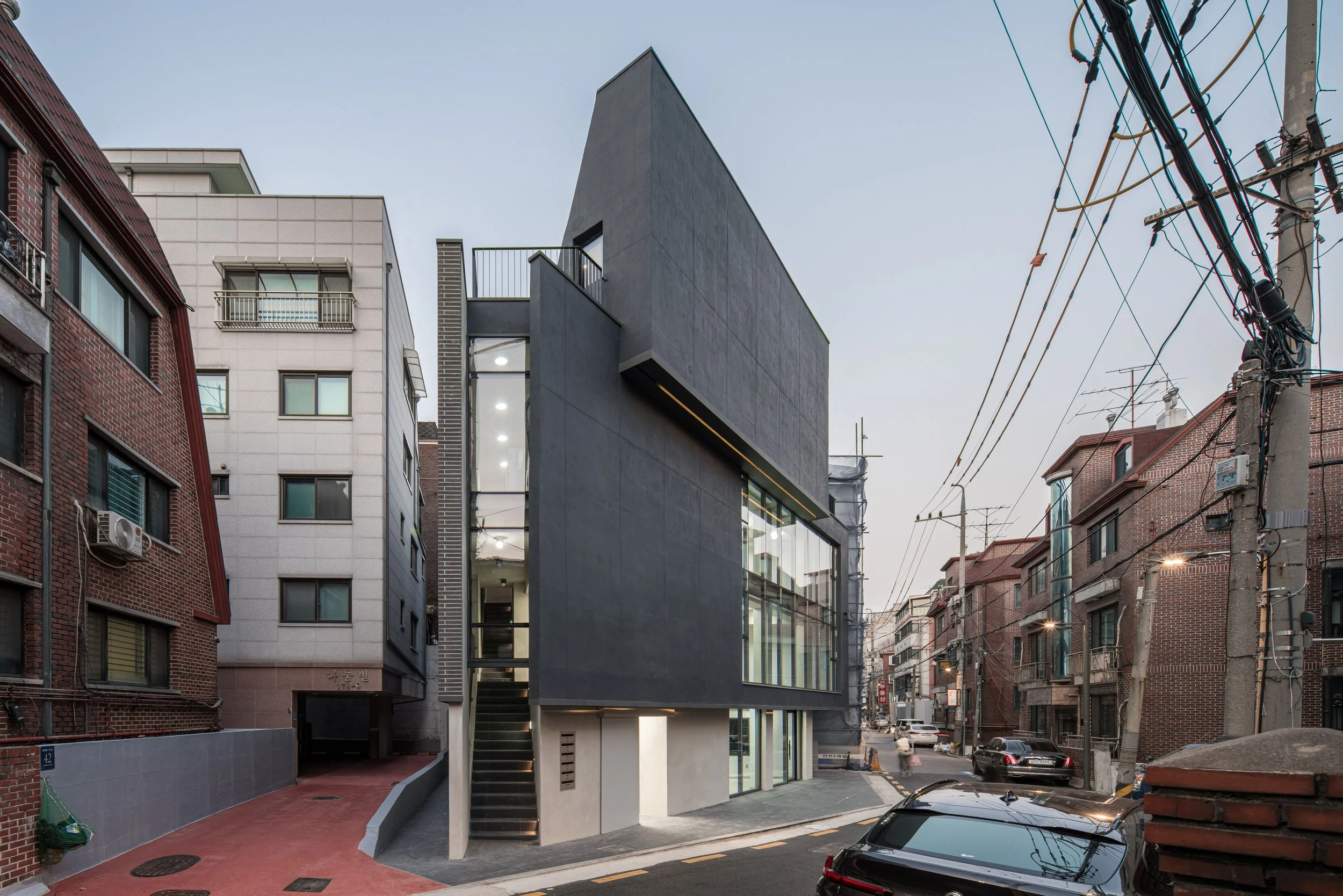 각 시대의 유행과 다양한 재료, 불법증축으로 들쑥날쑥해진 형태와 각종 부착물 등 오래된 주택가의 어지러운 풍경 속에서 새로운 근생으로서 존재감이 필요했다. 화려함과 장식은 최대한 지양하고, 외관을 이루는 각각의 개별 요소들은 크고 단순한 언어를 사용하여 주변과 차별화를 시도하였다. 일반적인 수익형 근생과는 다르게 사옥 등의 단독 임대를 염두에 두었기 때문에 건물의 외적인 형태도 층별로 반복되는 입면 등을 최대한 배제한, 하나의 유기적인 개체로 인식될 수 있도록 계획하였다.